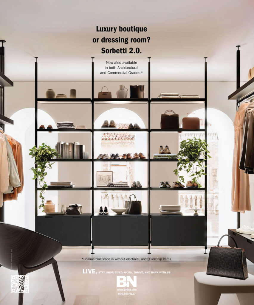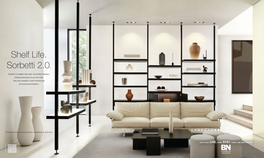 Sorbetti 2.0 defines seating areas while showcasing curated collections of art books and sculpture.