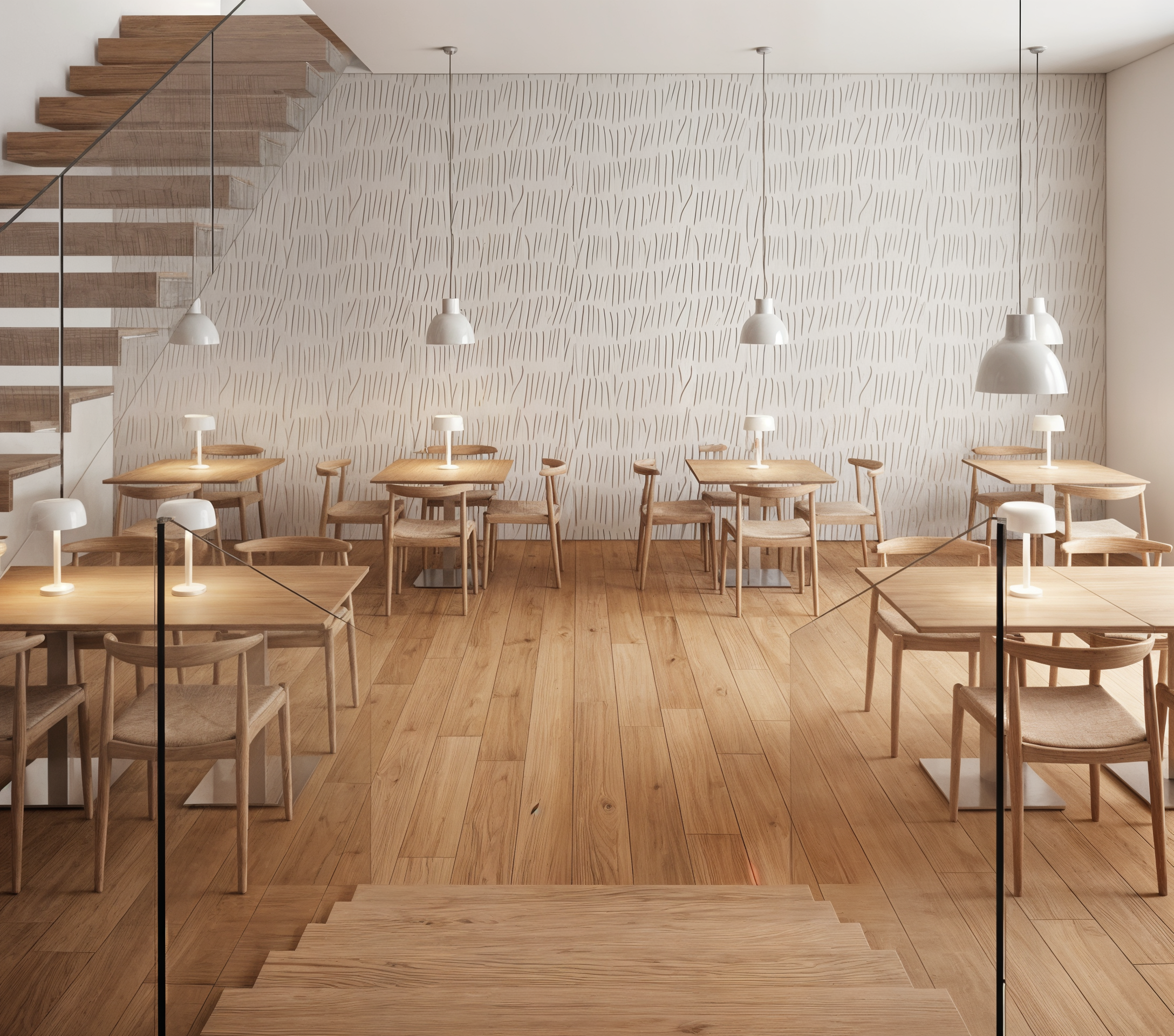 Fortina QuickStick Film and battens applied to various interiors with all the same wood grain tones.
