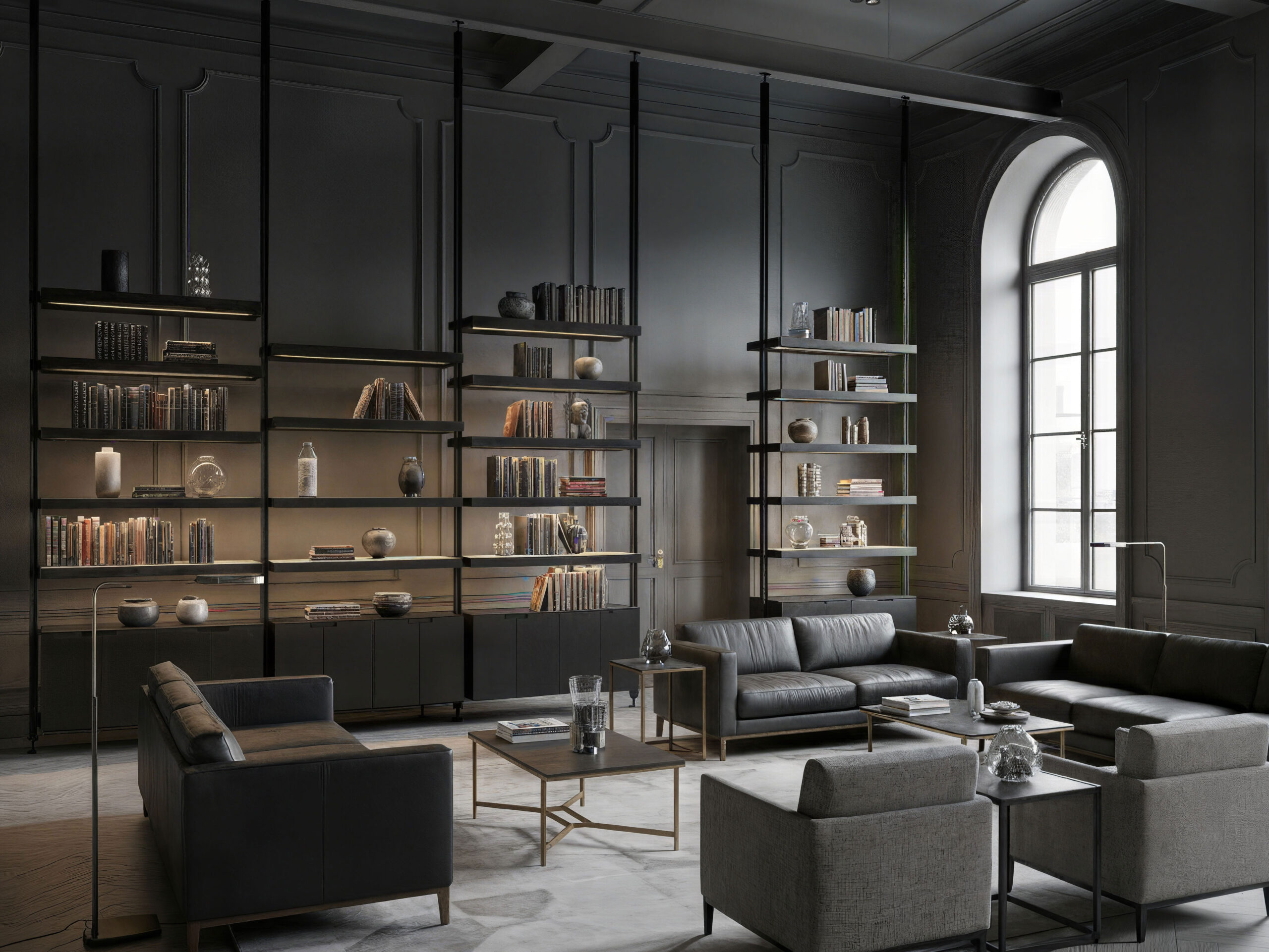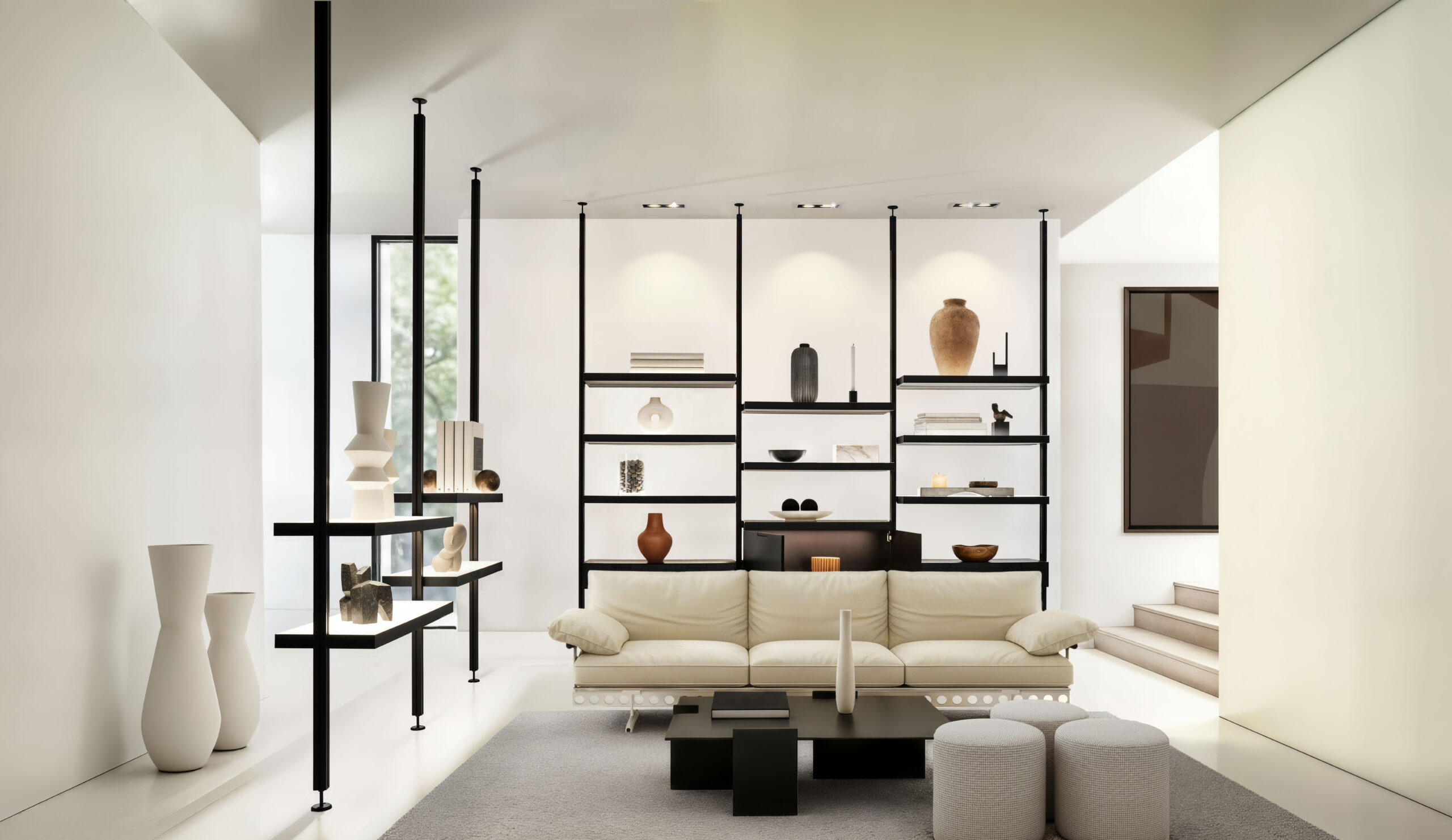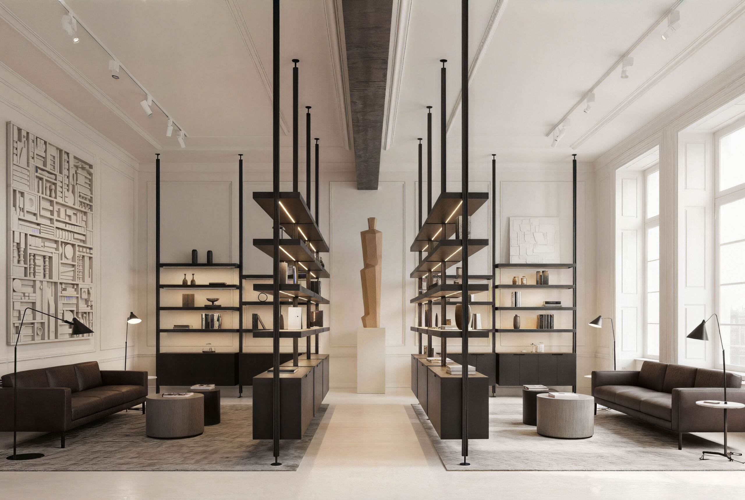 Sorbetti 2.0 defines seating areas while showcasing curated collections of art books and sculpture.