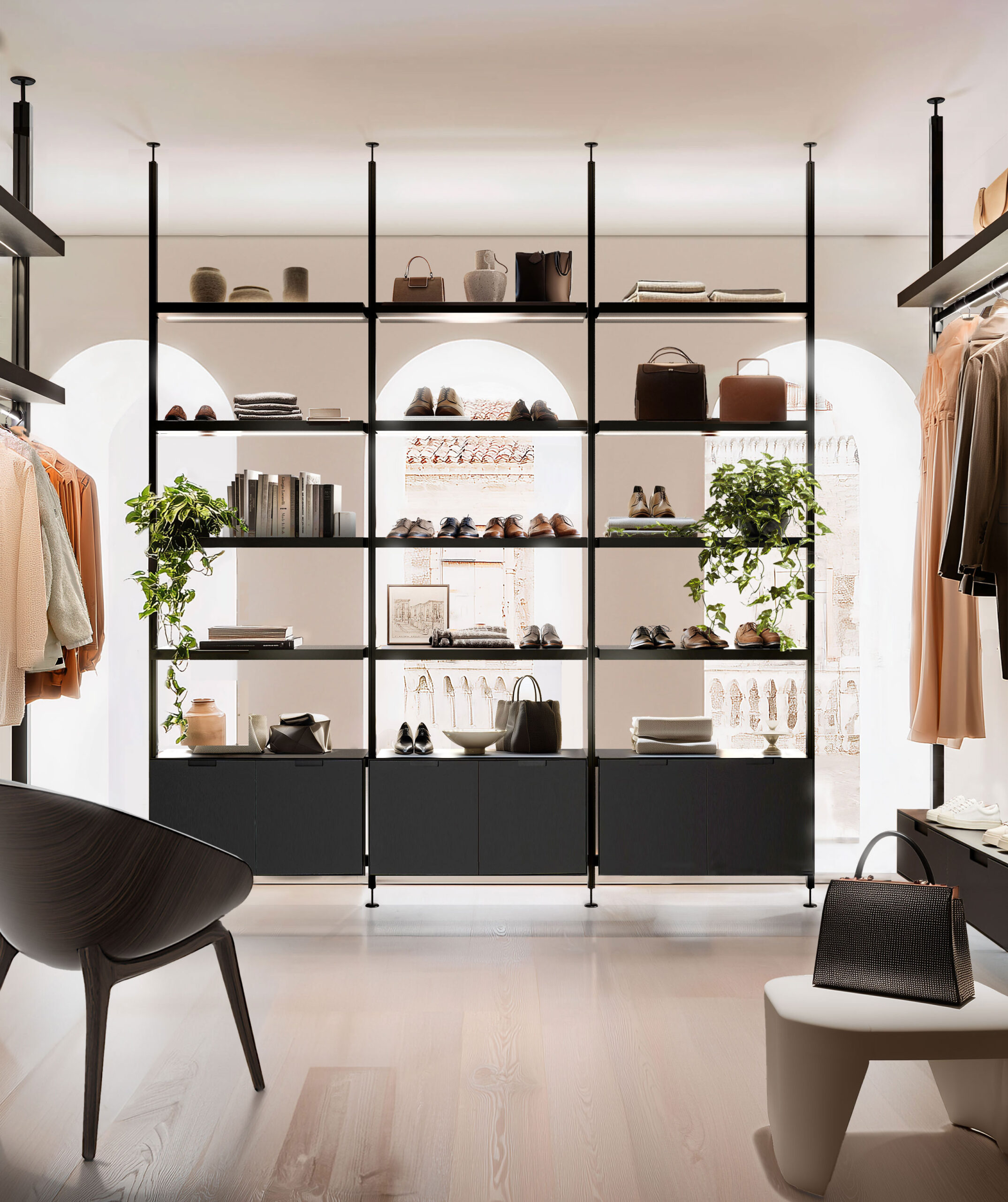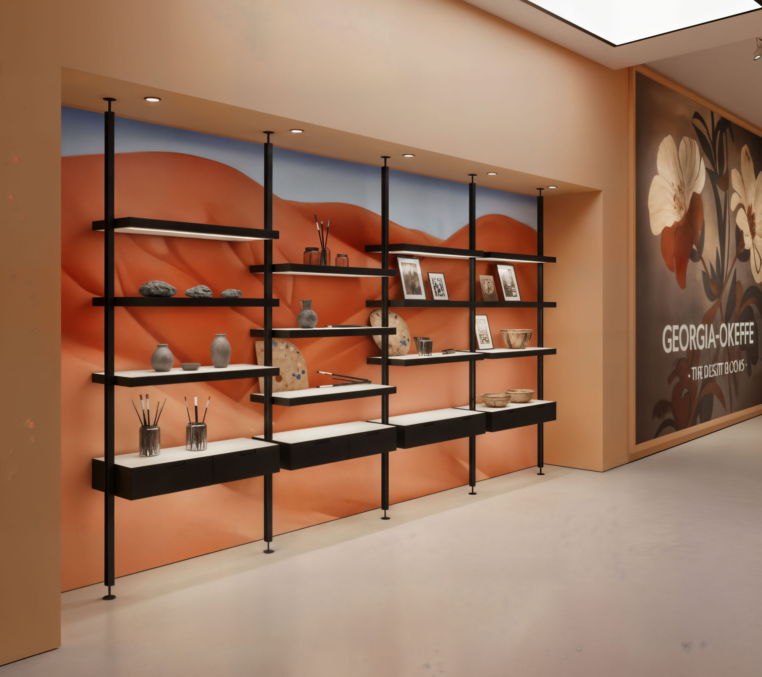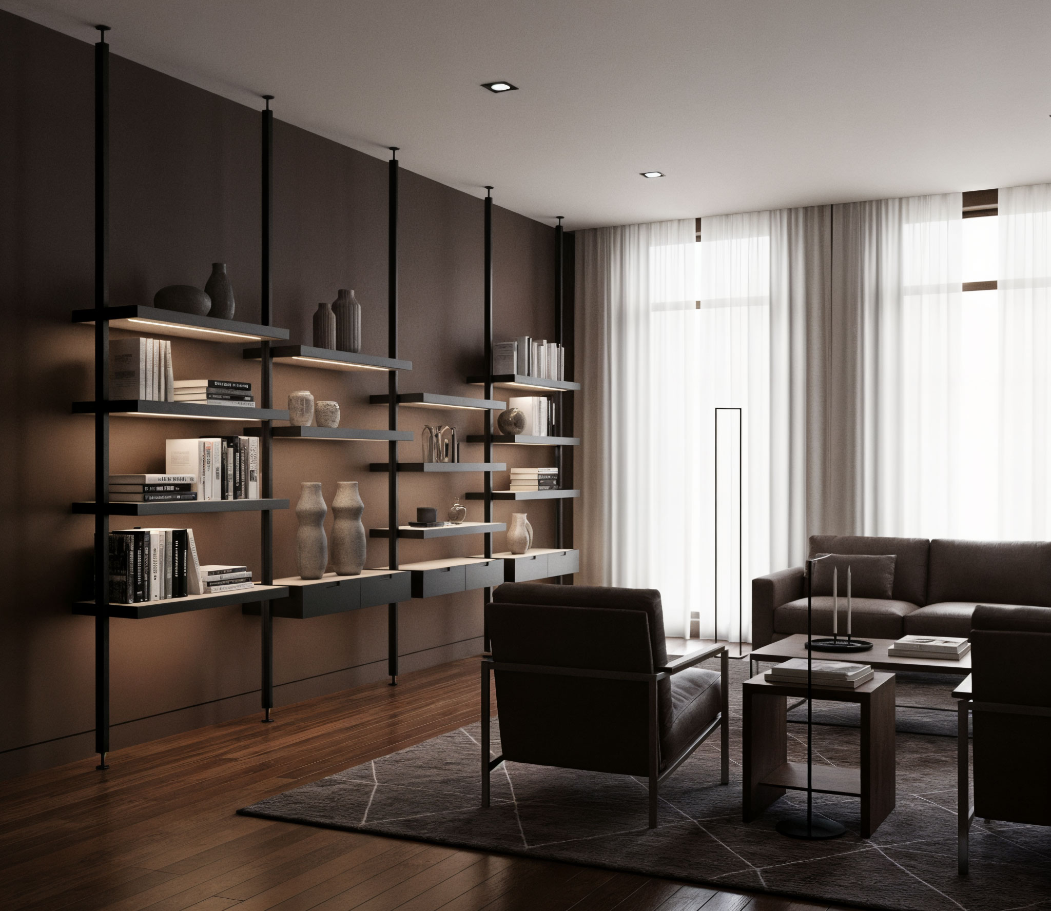 Sorbetti 2.0 defines seating areas while showcasing curated collections of art books and sculpture.
