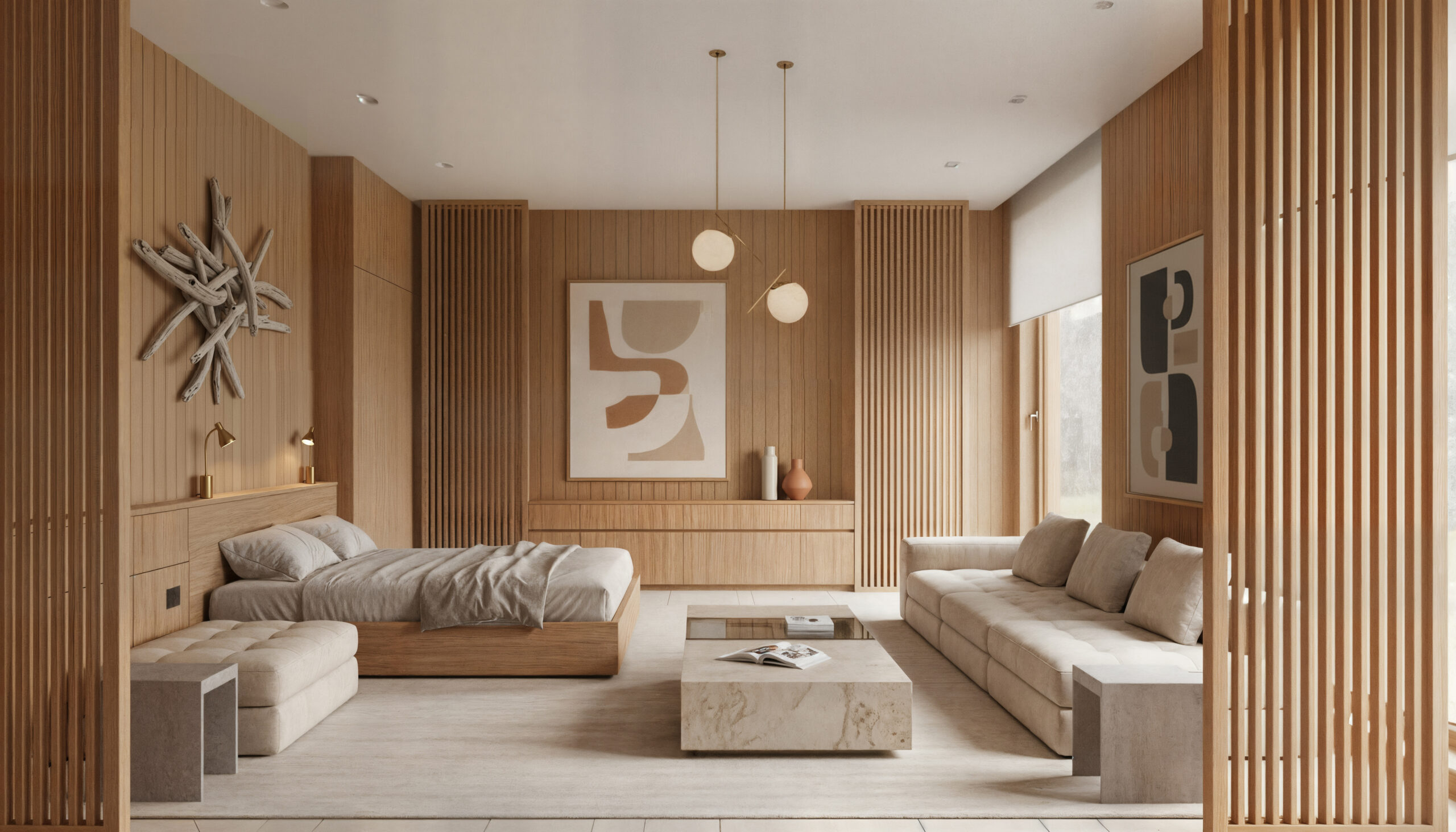 Fortina QuickStick Film and battens applied to various interiors with all the same wood grain tones.