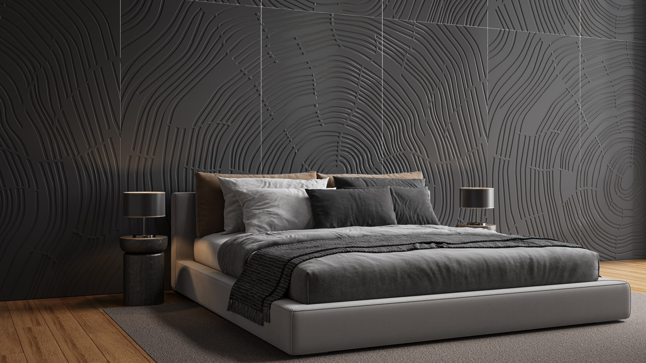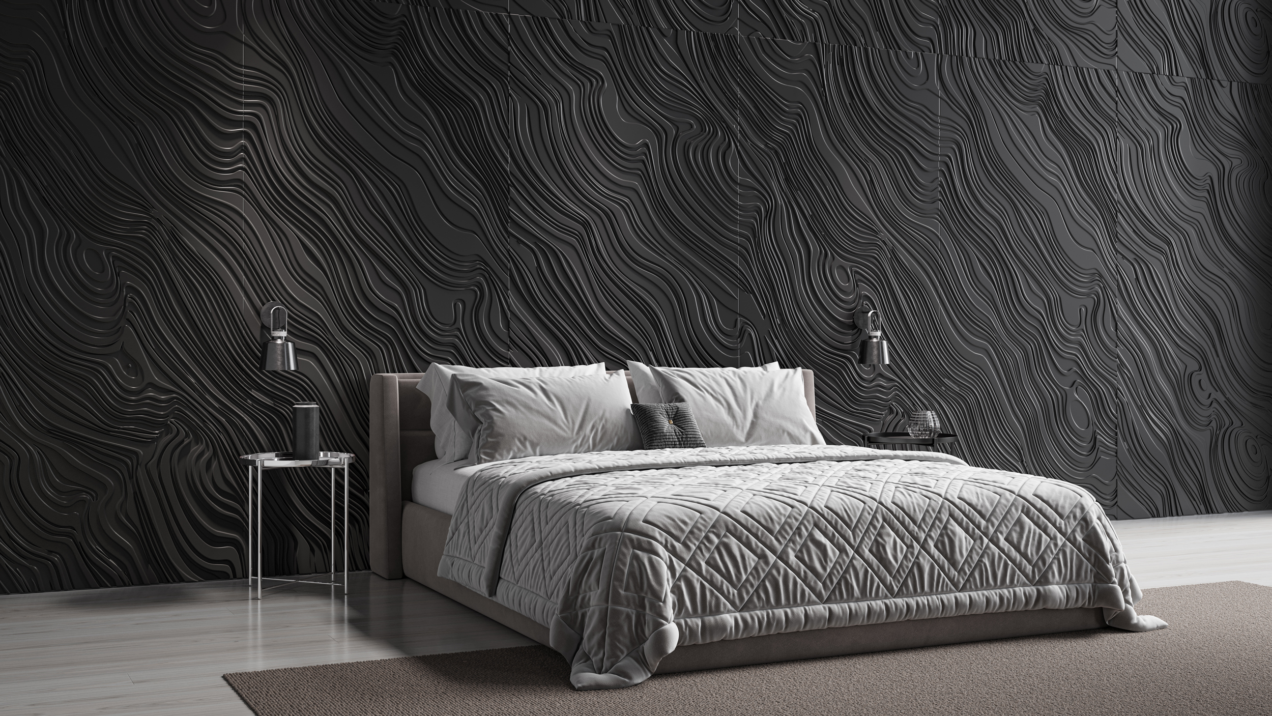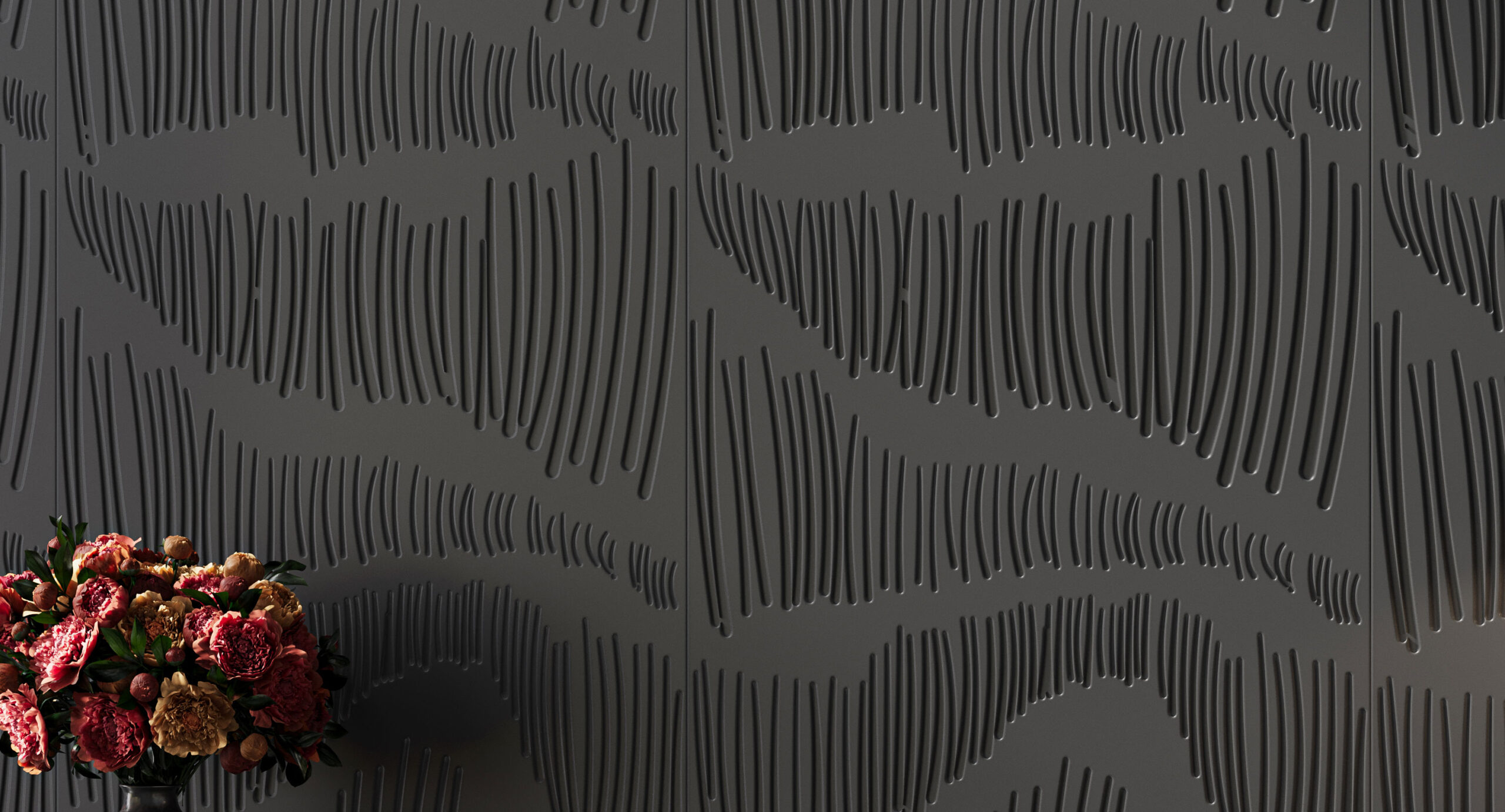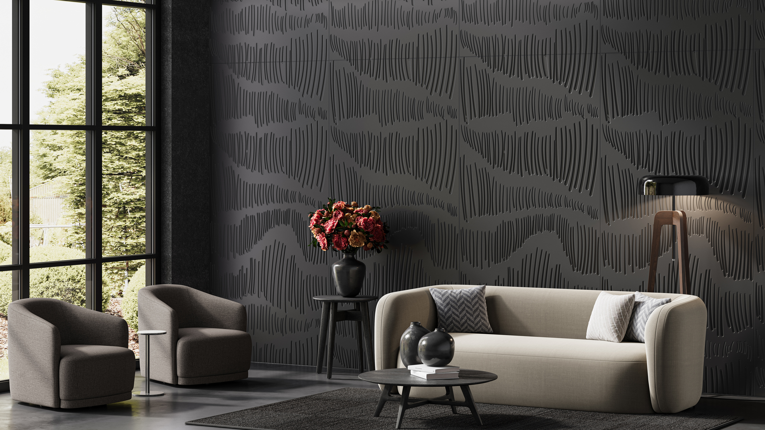 Here, the pattern River Ripples in Matte Black, inspired by the undulations of flowing water.