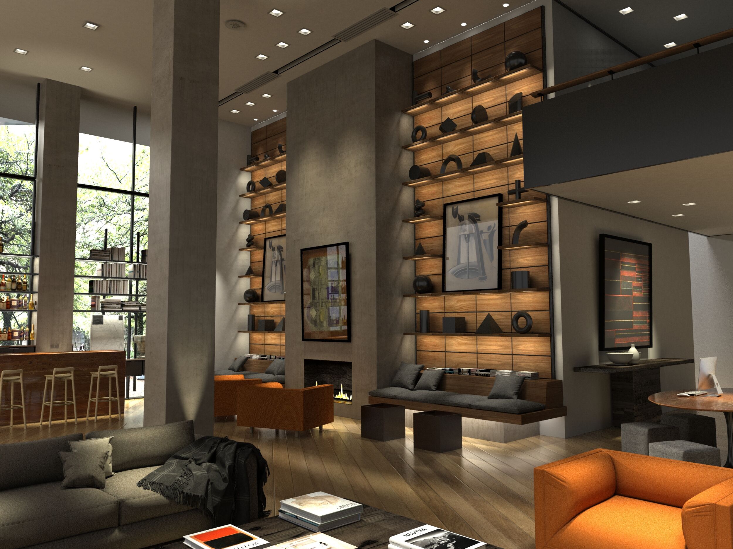 A lobby in a Palm Springs hotel, features a fireplace, benches, and lounge furniture, all in front of a tall System 1224 wall in warm walnut.