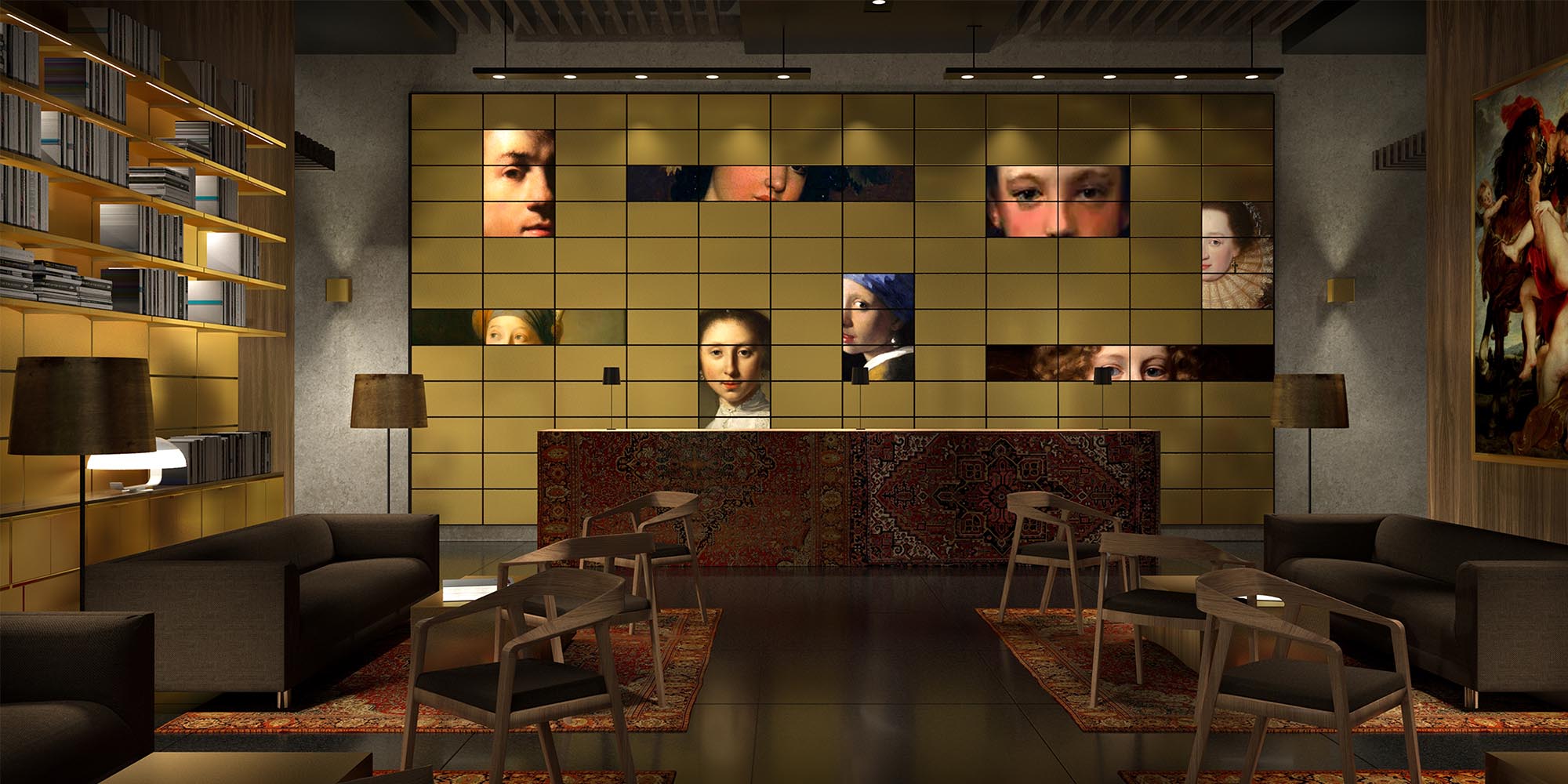 A hotel lobby makes a dramatic first impression with the interplay of gold-toned brass System 1224 and sections of historic portraits.