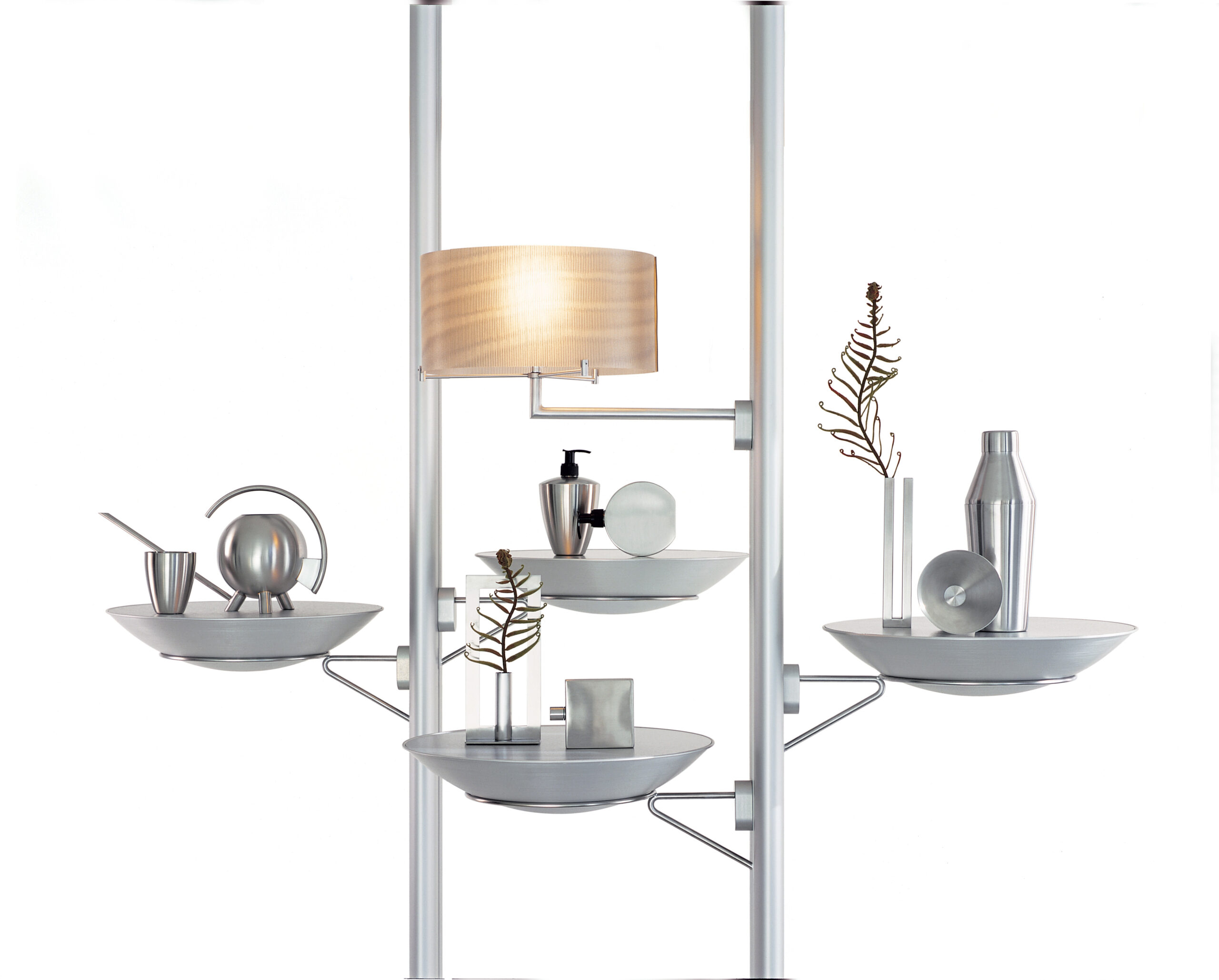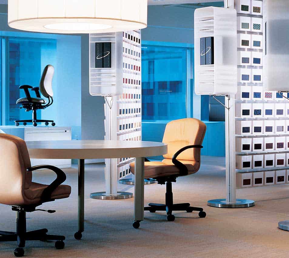 “I want a pole-based system” said the owner of B+N one afternoon. The following day I collected our Pucks, a length of aluminum extrusion sitting around the warehouse, taped it all to an old Eames Eiffel Tower chair base, and bent some colored pantone film on the edges. The seed of an idea from what I could find laying around can grow into a robust and popular system.