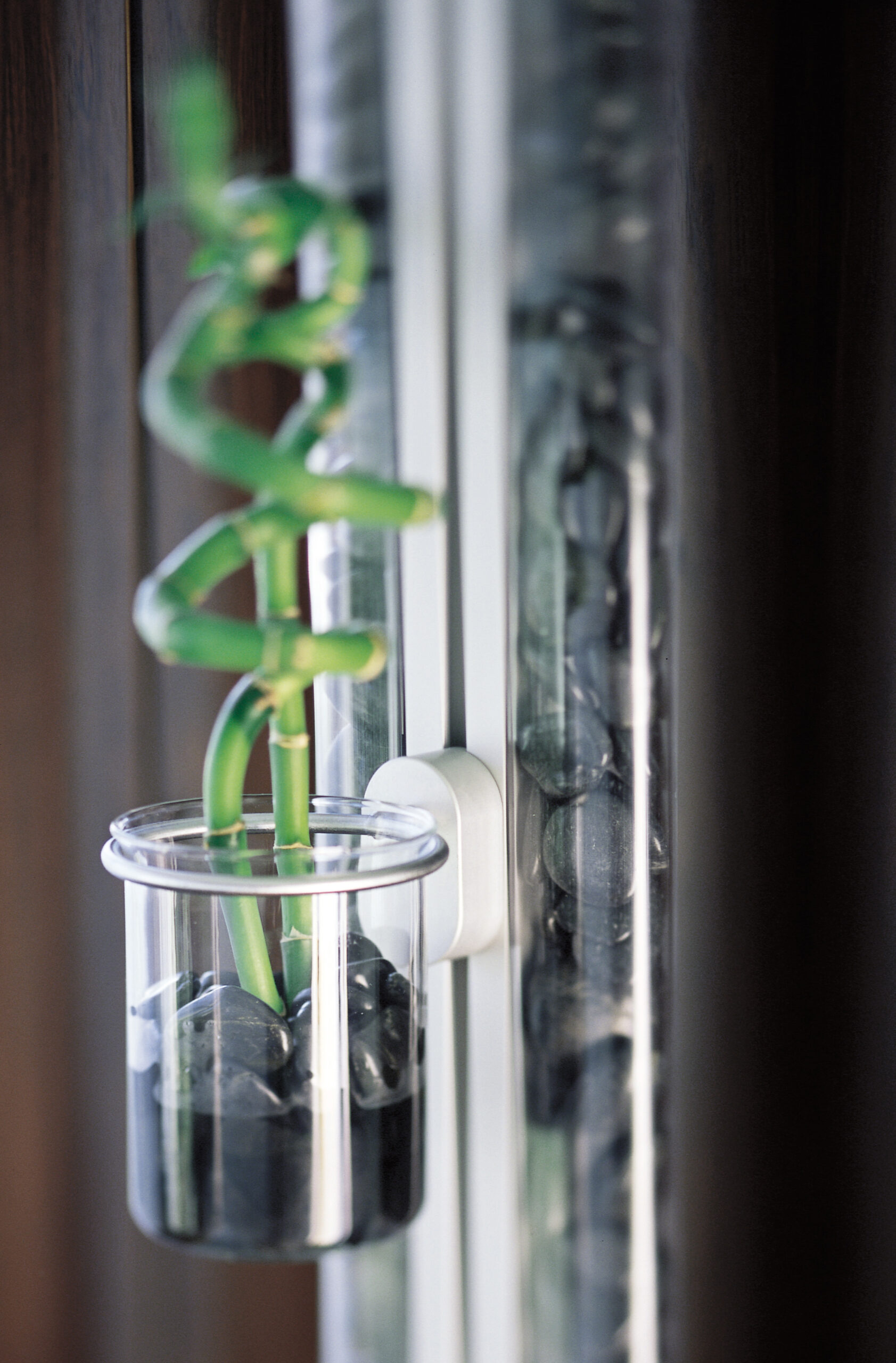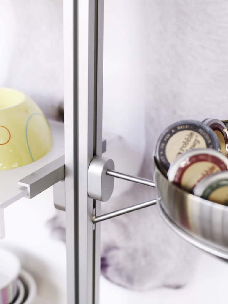The white oak Sliders or “fins” slip into the side channels of the Uprights, creating an natural, Scandi aesthetic