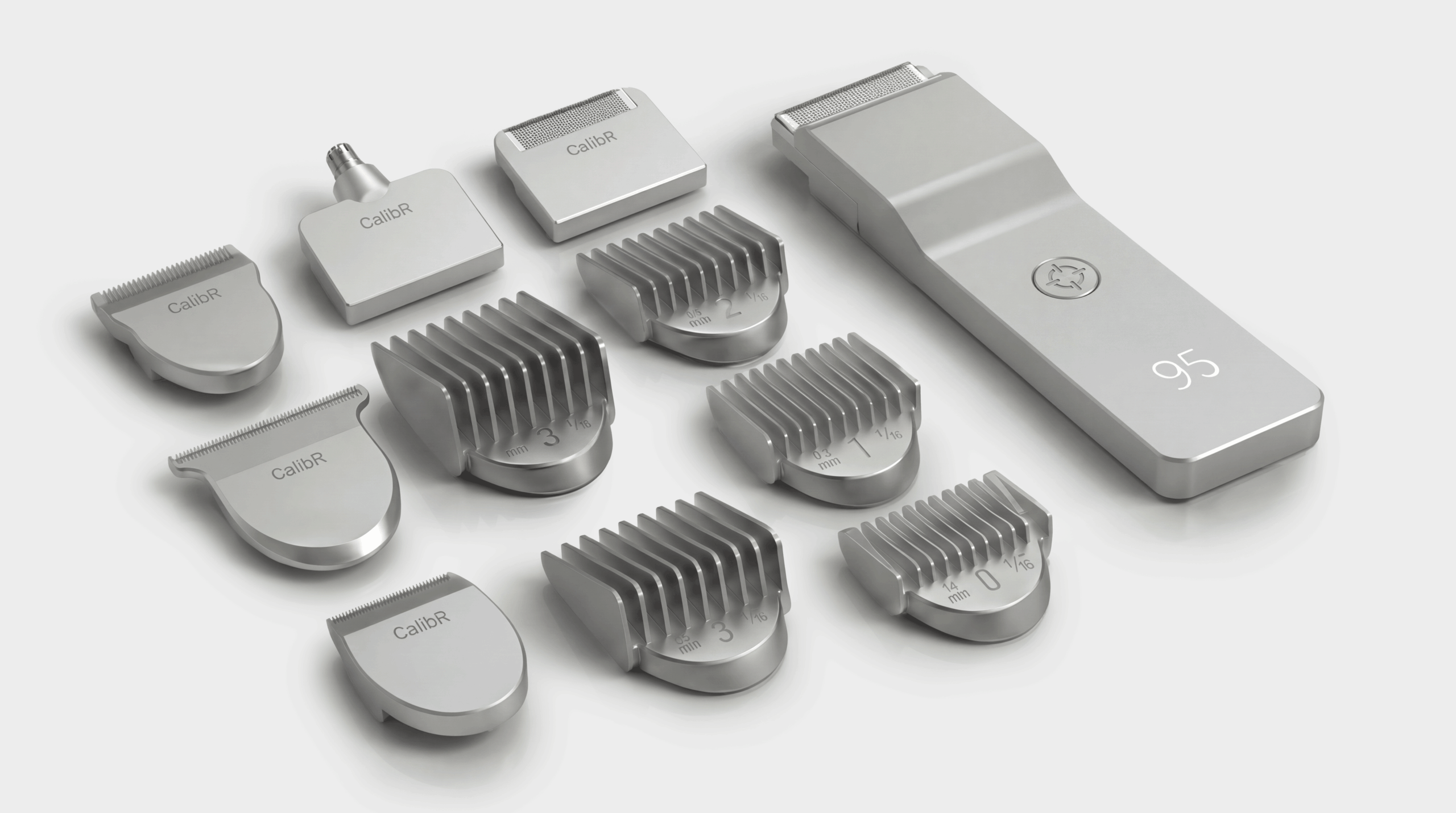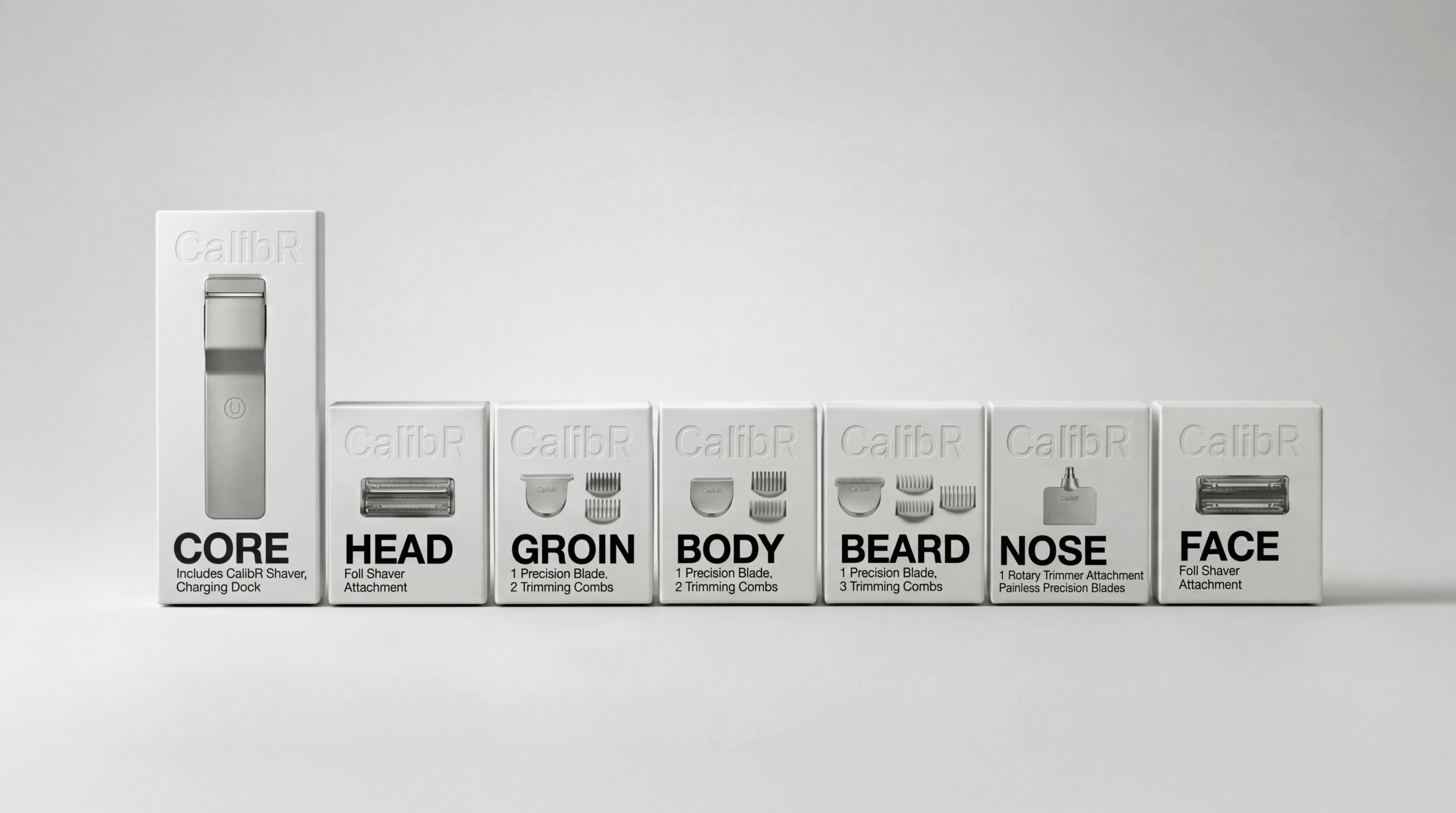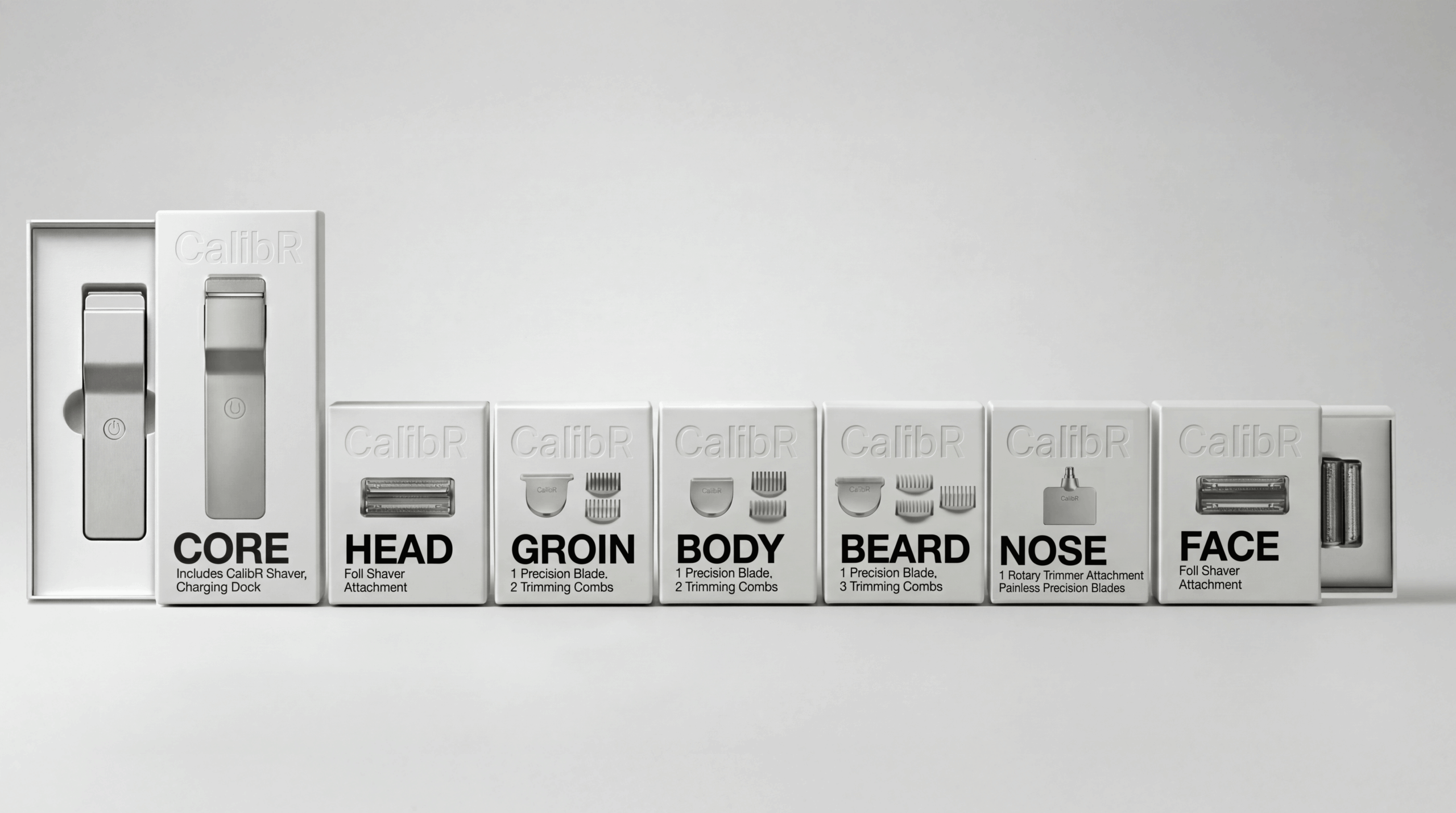CalibR is a flat aluminum grooming system built around a single modular handle and six precision head collections — HEAD, FACE, BEARD, BODY, GROIN, and EAR | NOSE. Each head magnetically attaches to the CORE unit, which charges wirelessly and displays battery level through a ghost charge display embedded in the aluminum surface.