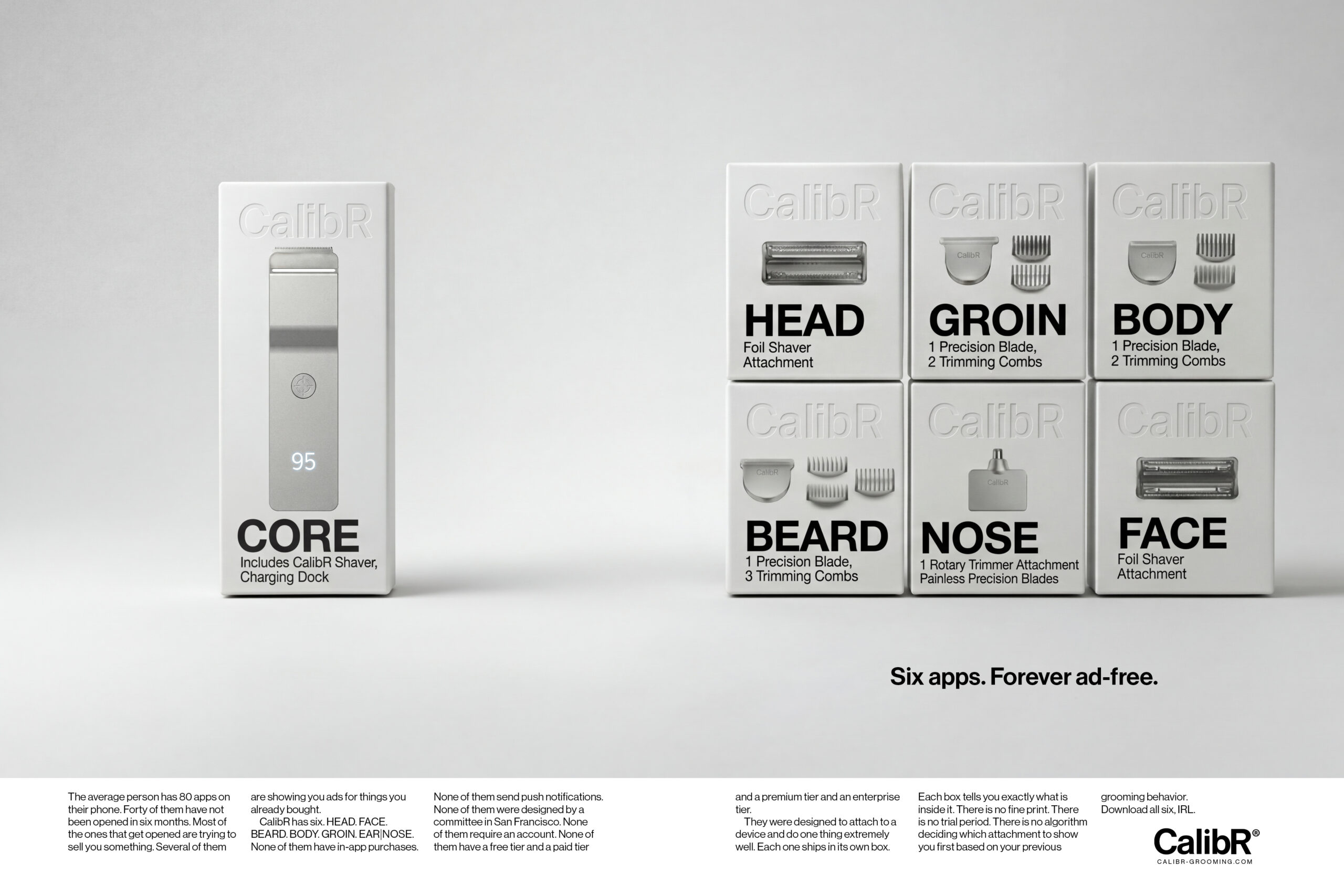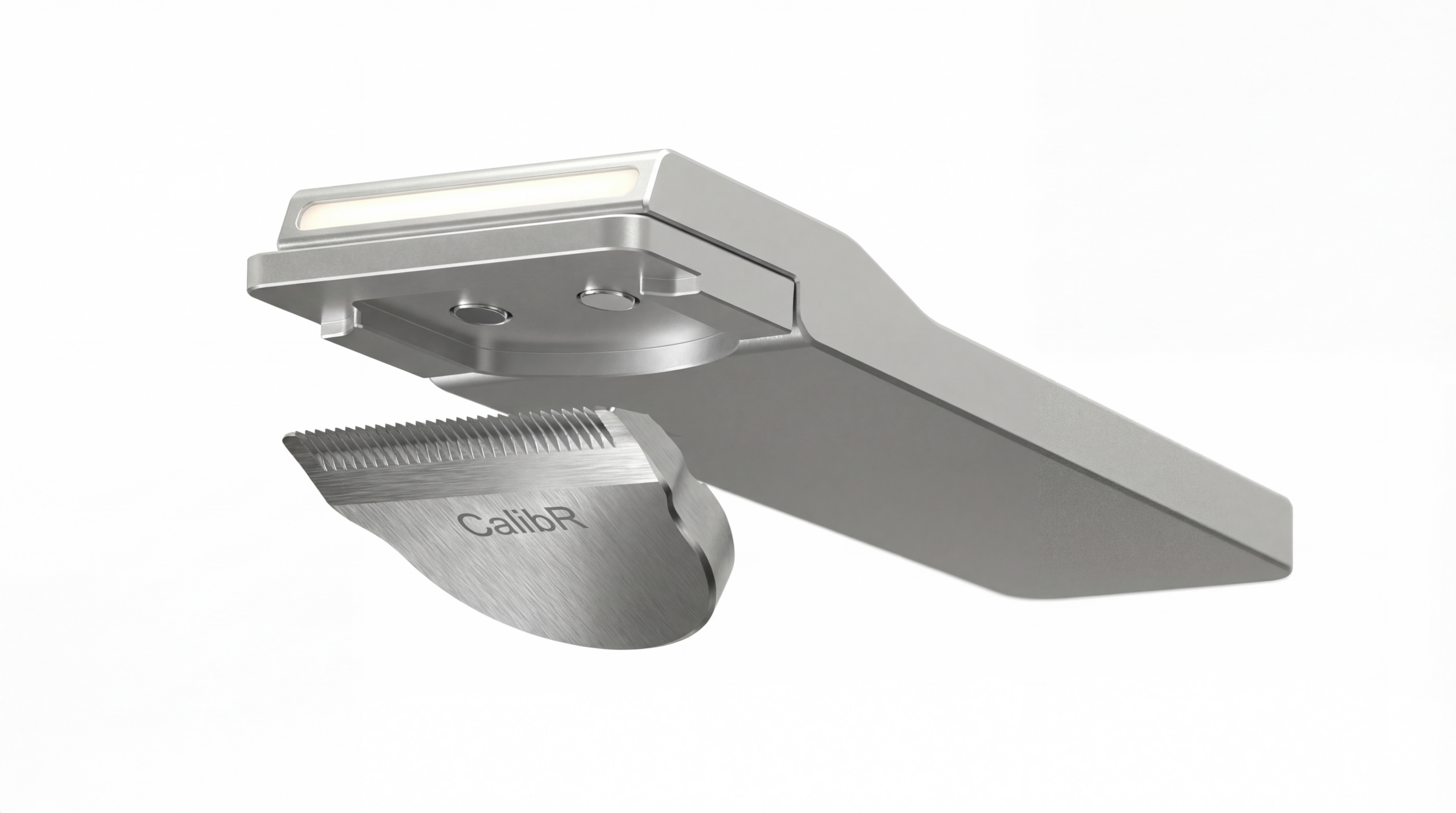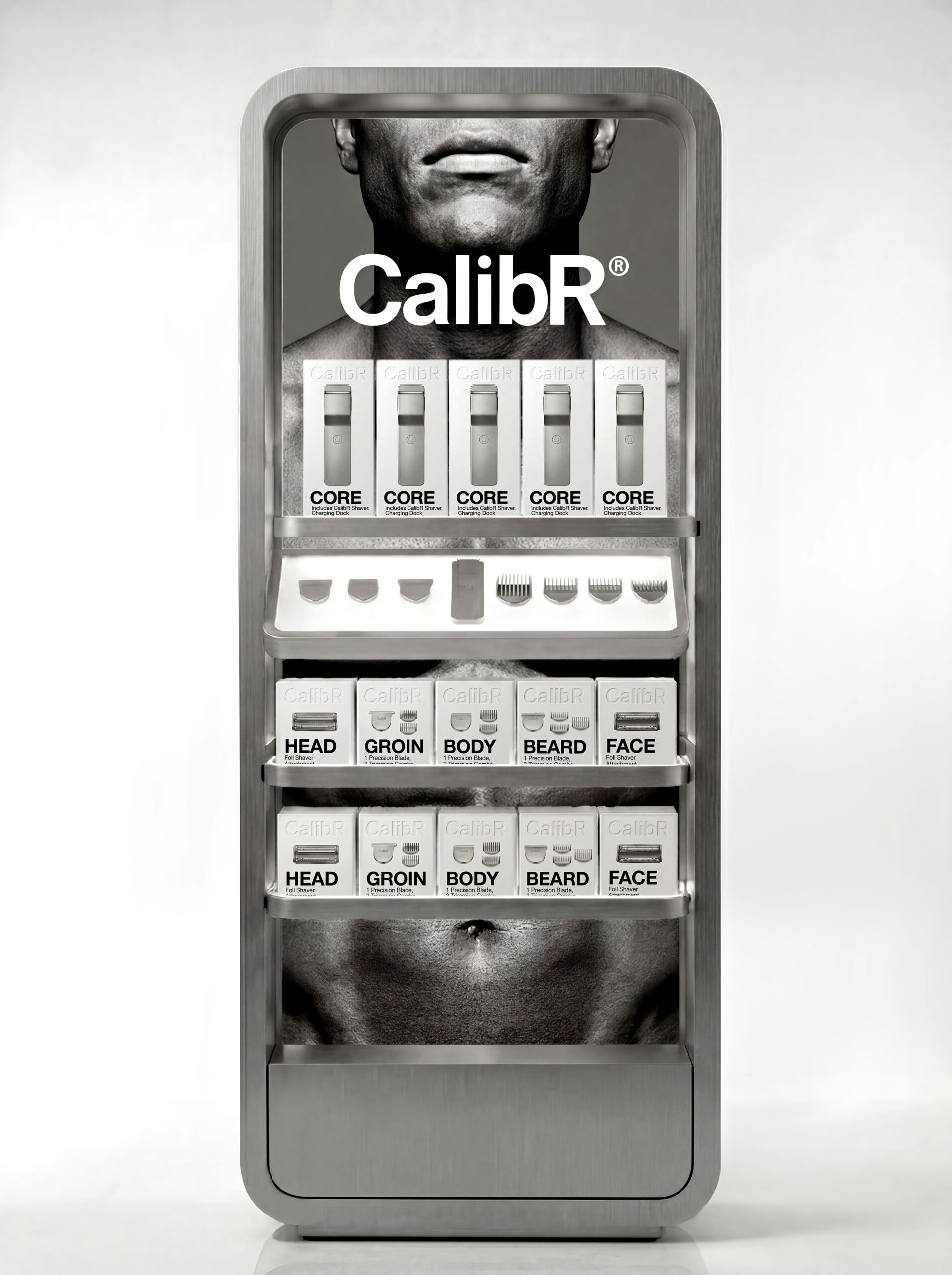 CalibR is a flat aluminum grooming system built around a single modular handle and six precision head collections — HEAD, FACE, BEARD, BODY, GROIN, and EAR | NOSE. Each head magnetically attaches to the CORE unit, which charges wirelessly and displays battery level through a ghost charge display embedded in the aluminum surface.
