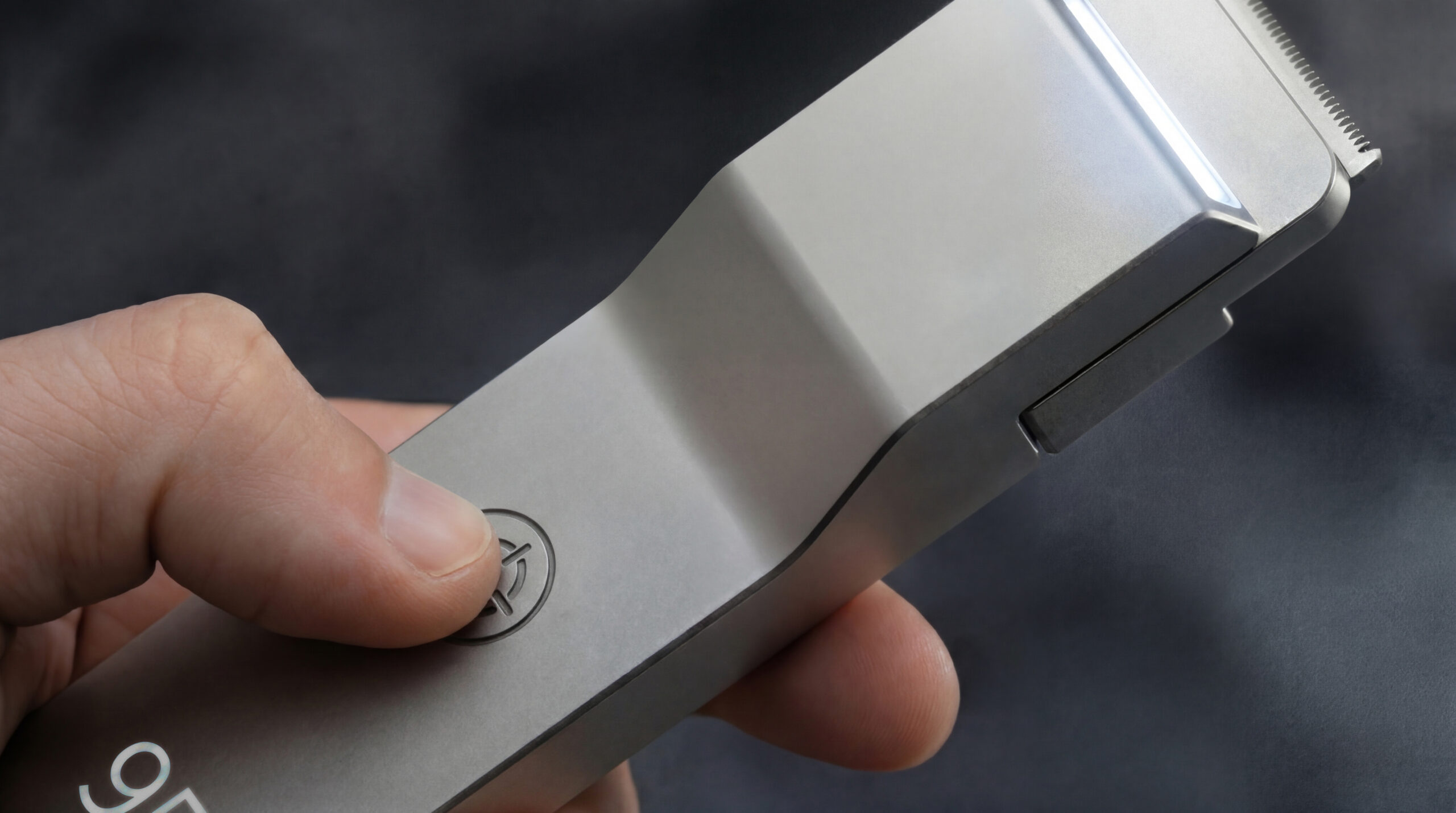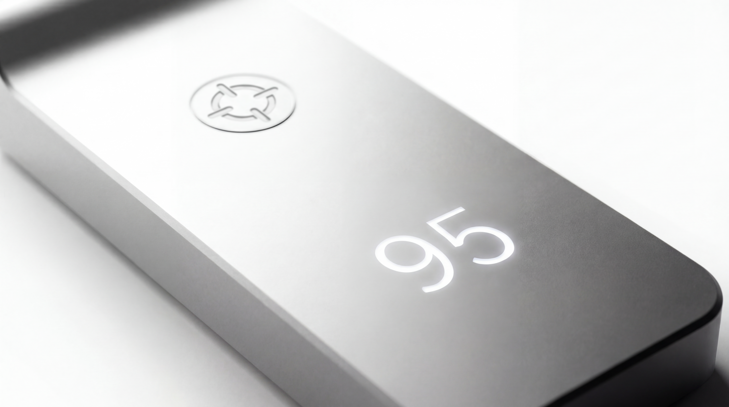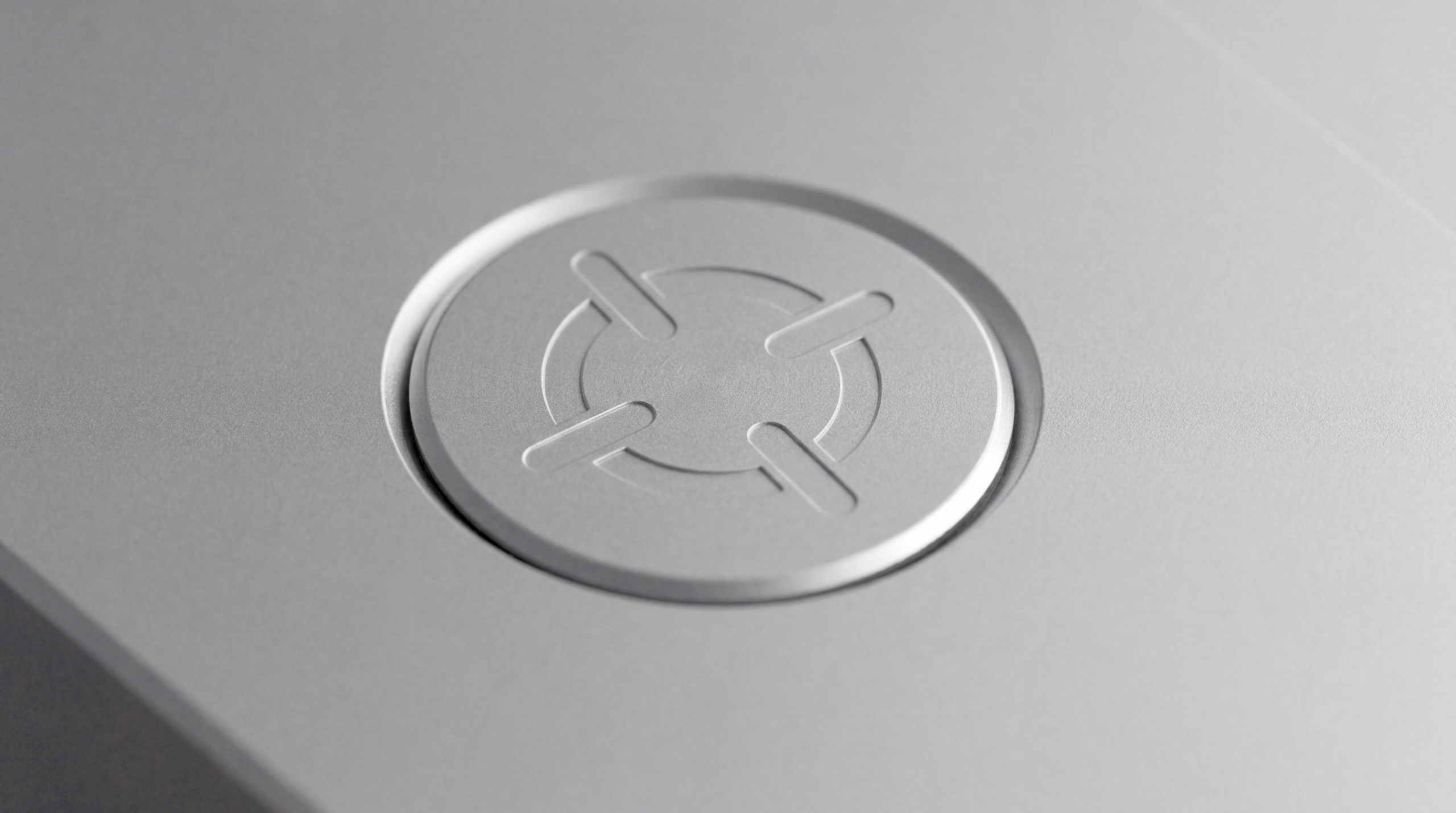 The crosshair replaces the power symbol — pressed into brushed aluminum, present every time the device is used.