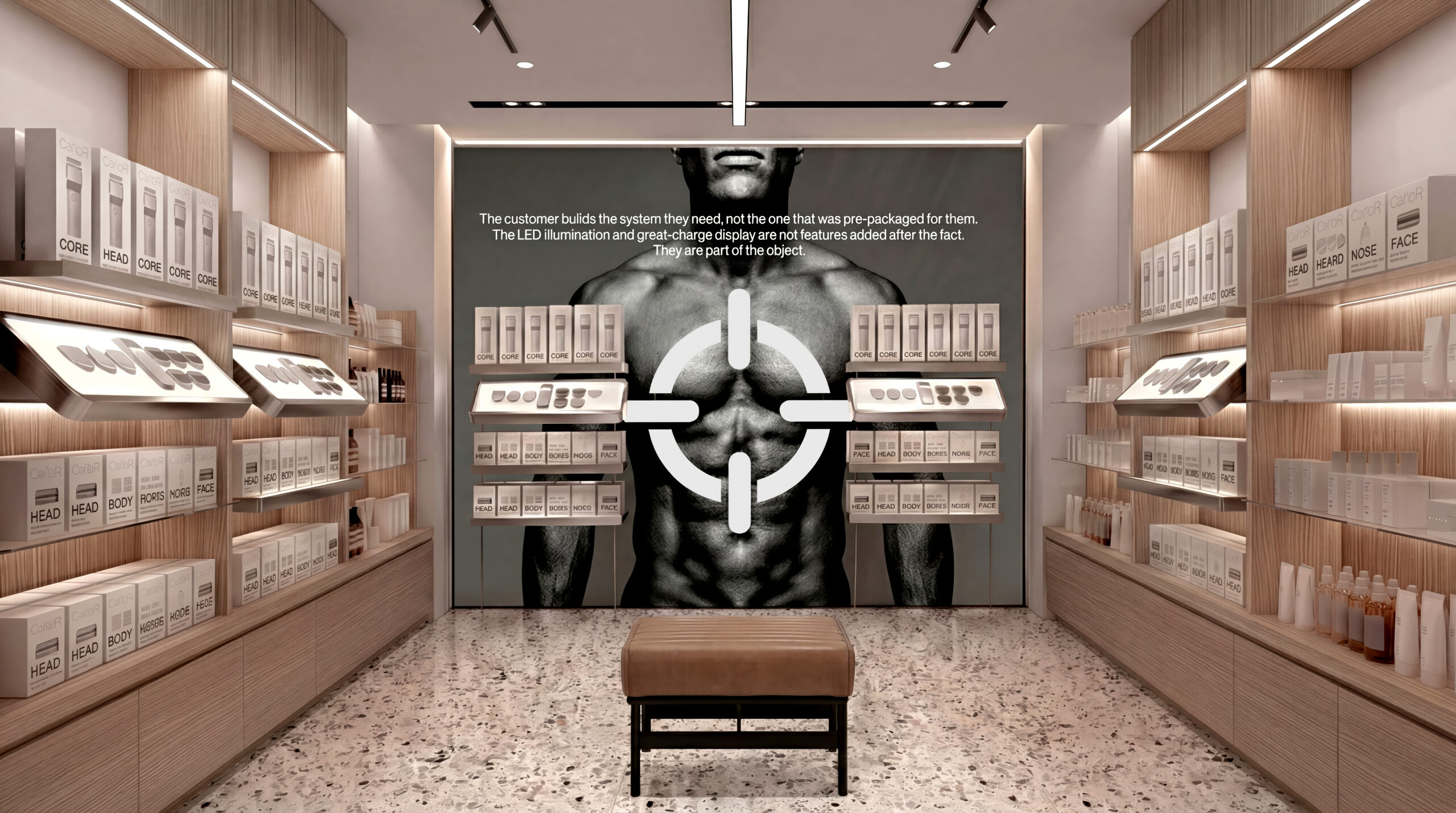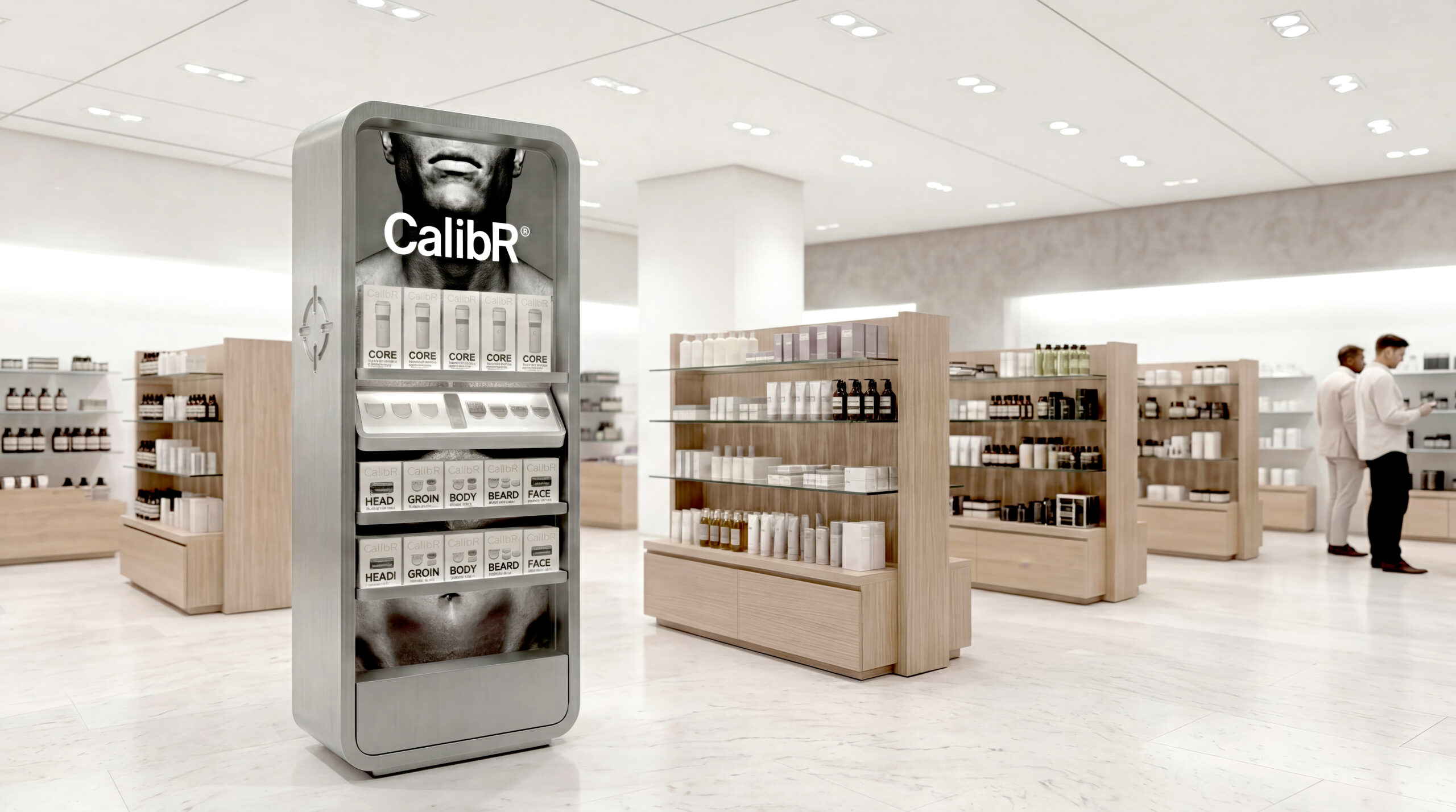 The floor fixture is the product at retail scale. Aluminum. Rounded corners. The same form language as the CORE unit — large enough to stop traffic, precise enough to close the sale.