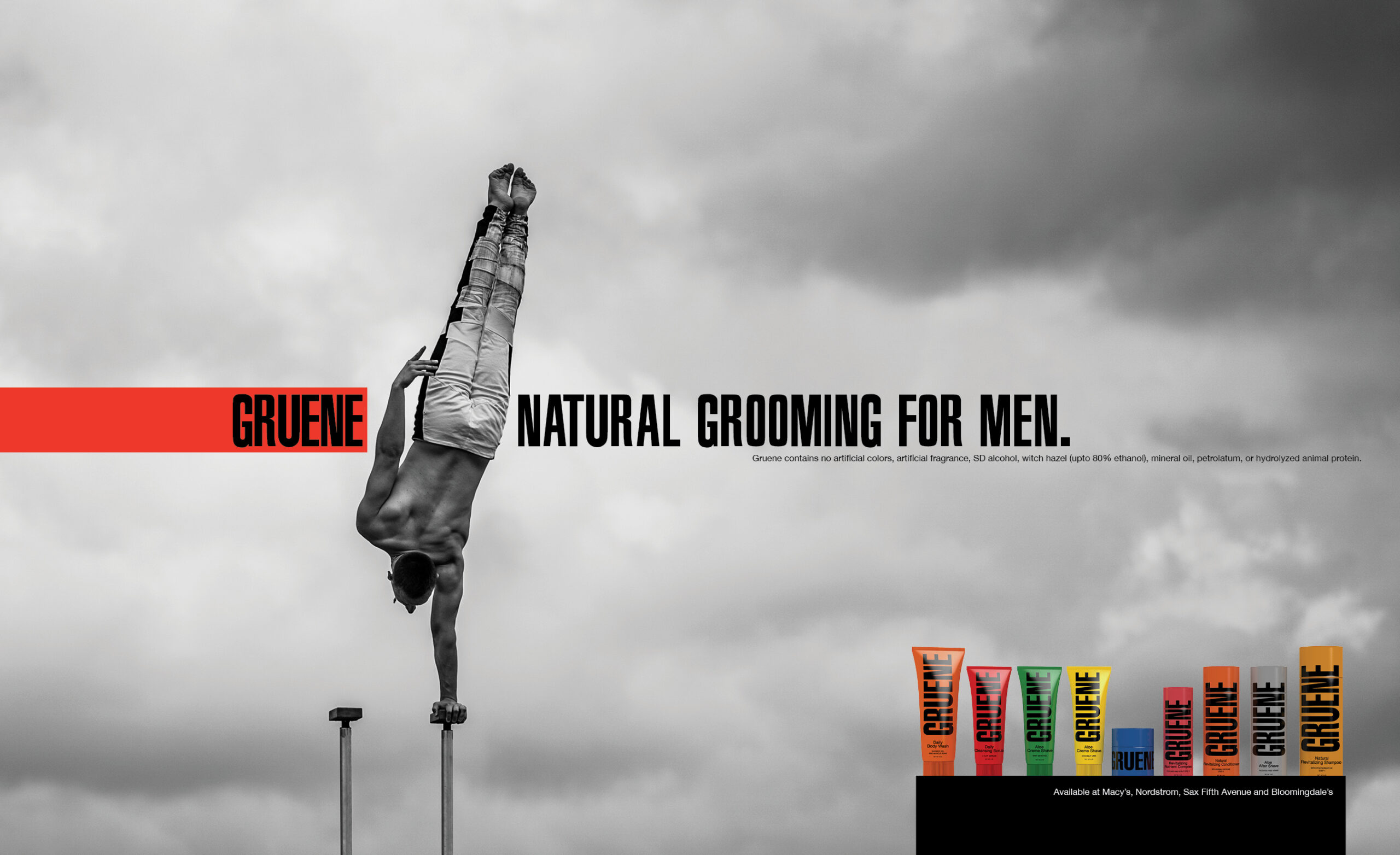When men’s skincare was dominated by dull greens and grays, Gruene broke through with a vibrant, sporty identity—primary colors, bold type, and natural ingredients for the health-conscious man. They reframed skincare as part of total wellness, pairing eye-catching packaging with dynamic, sports-driven black-and-white imagery that made their products impossible to ignore.