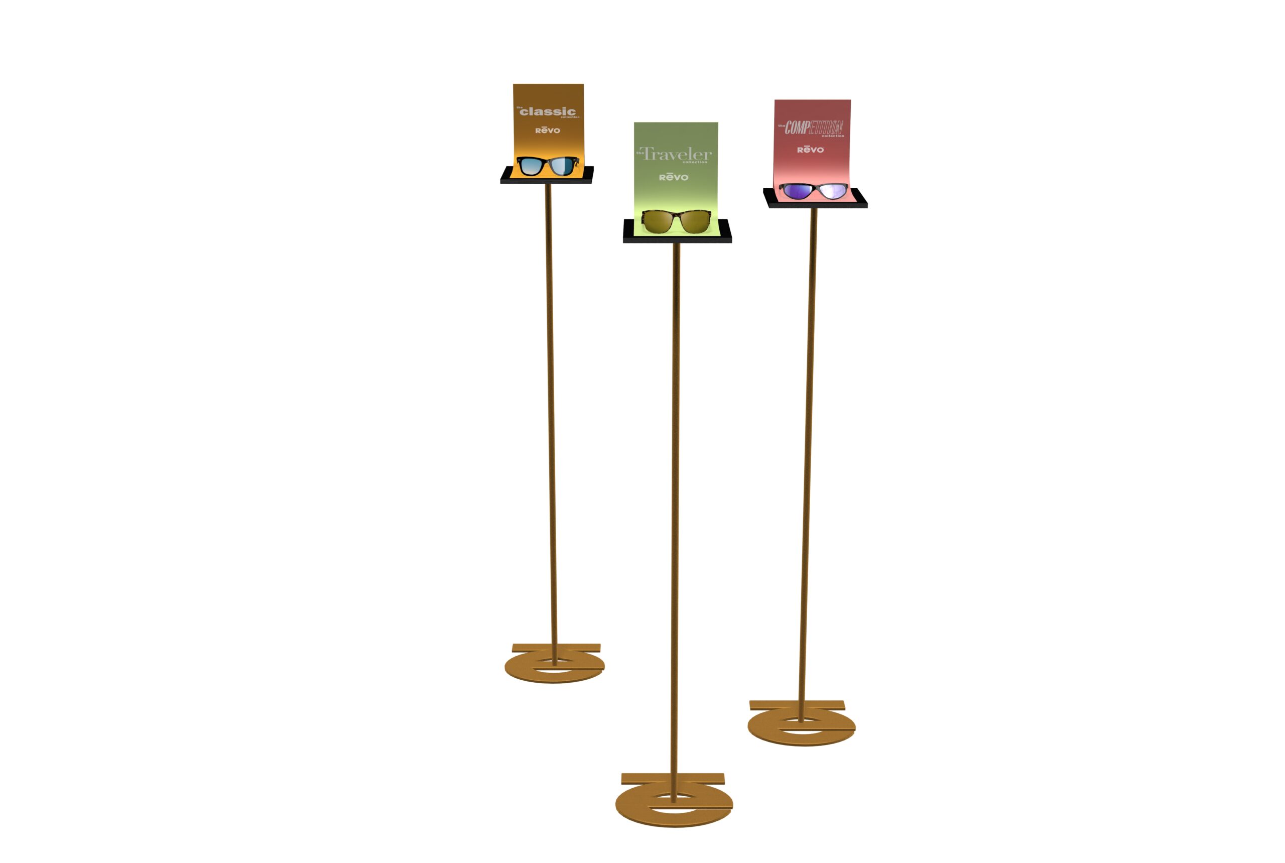 An opportunity to bring the product out of display cases and onto other areas of a shop: the e-stands are case metal “ē” logo and sunglasses tethered to changeable cards.