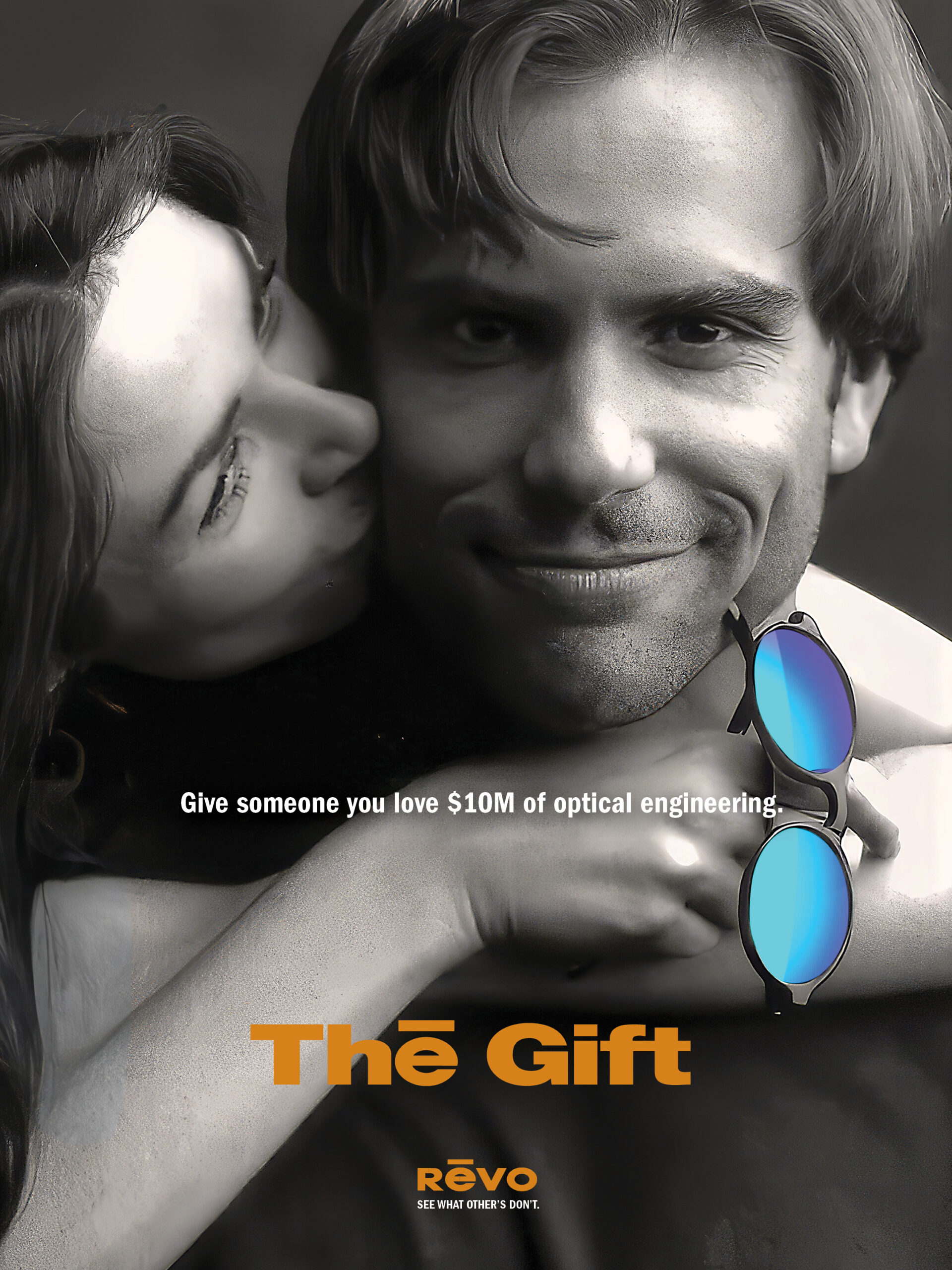 A national holiday program turned Rēvo into Thē Gift of the season, pairing the brand’s accentuated ē with the tagline “Give someone you love $10M of optical engineering.” The campaign shattered holiday sales records.